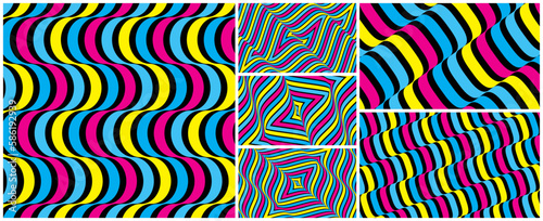 Wavy pattern with optical illusion. Optic art illustration of color rectangles. Abstract striped background. 3d vector illustration for brochure, cover, textile, poster, presentation or banner.