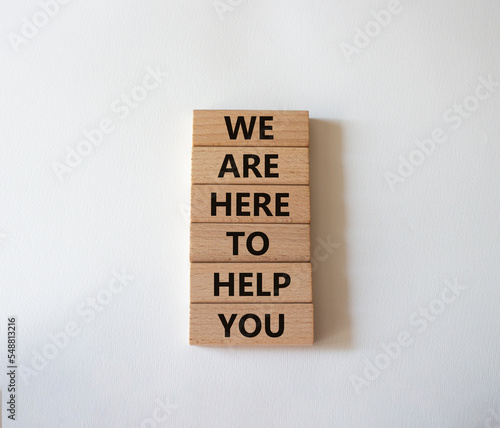 We are here to help you symbol. Concept words we are here to help you on wooden blocks. Beautiful white background. Business and we are here to help you concept. Copy space.