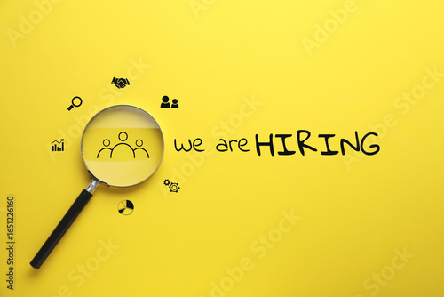 We are hiring. Inscription, icons and magnifying glass on yellow background, top view