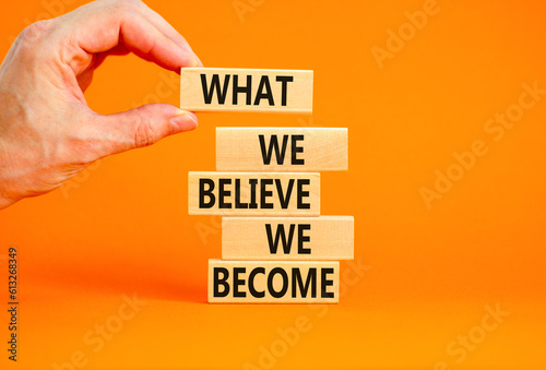 We become or believe symbol. Concept word What we believe We become on wooden block. Beautiful orange table orange background. Businessman hand. Business we become or believe concept. Copy space.