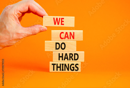 We can do hard things symbol. Concept words We can do hard things on wooden blocks. Beautiful orange table orange background. Businessman hand. Business, we can do hard things concept. Copy space.