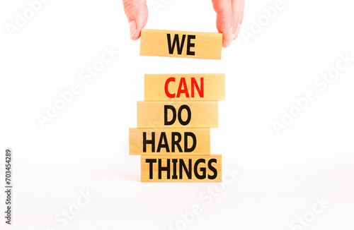 We can do hard things symbol. Concept words We can do hard things on wooden blocks. Beautiful white table white background. Businessman hand. Business, we can do hard things concept. Copy space.