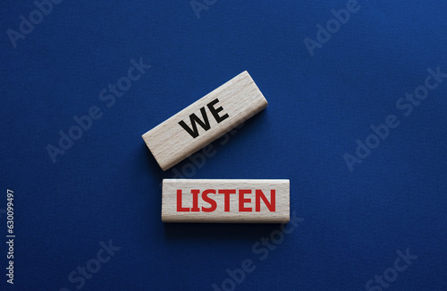 We listen symbol. Wooden blocks with words We listen. Beautiful deep blue background. Business and We listen concept. Copy space.