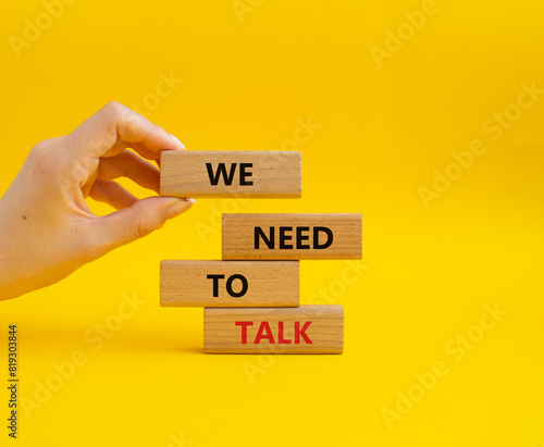 We need to talk symbol. Concept words We need to talk on wooden blocks. Beautiful yellow background. Businessman hand. Business and We need to talk concept. Copy space.