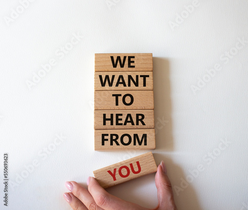 We want to hear from you symbol. Wooden blocks with words We want to hear from you. Beautiful white background. Businessman hand. Business and We want to hear from you. Copy space.
