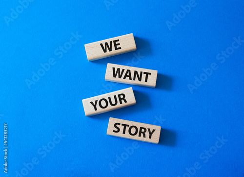 We want your story symbol. Concept words We want your story on wooden blocks. Beautiful blue background. Business and We want your story concept. Copy space.