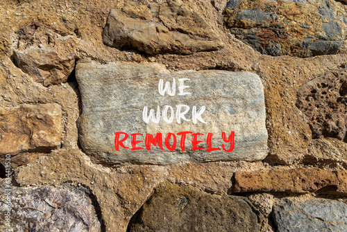 We work remotely symbol. Concept words We work remotely on beautiful big stone on stone wall. Beautiful stone wall background. Business we work remotely remote work concept. Copy space.