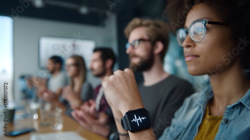 Wearable health tech dashboard displaying team biometrics during a wellness break at the office with a diverse group.