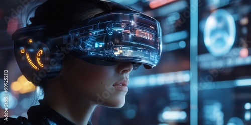 Wearable tech in a futuristic setting, displaying holographic interfaces and immersive virtual reality features, redefining personal technology.