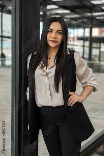 wearing a vest, blouse and elegant office clothes a young latin woman with straight hair, workplace and lifestyle, business person portrait