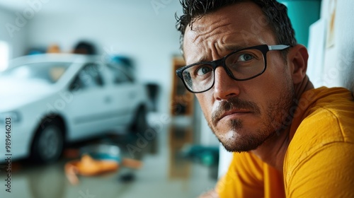 Wearing glasses and a yellow shirt, a man looks away pensively beside a white car amidst a flooded garage, reflecting resilience and uncertainty.