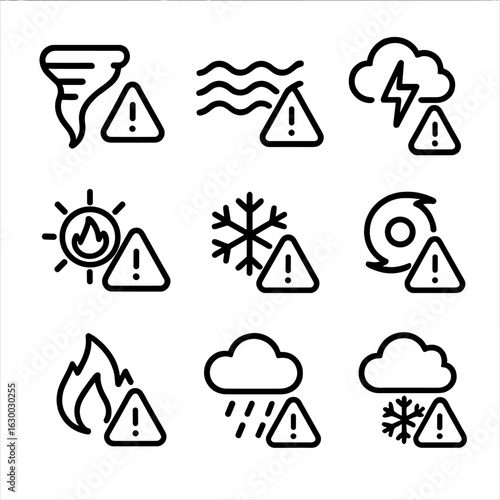 Weather Alert Icons. Outline icon set of weather alerts: tornado warning, flood warning, thunderstorm warning, heatwave alert,