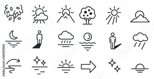 Weather and nature outline icons set – flat, linear, climate and environment symbols