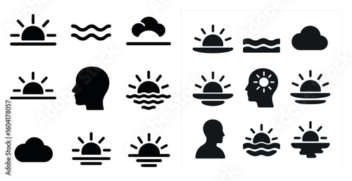 Weather and nature solid icons set – flat, filled, sun and cloud symbols