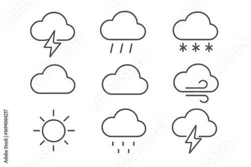 Weather forecast line icon set. Meteorology symbols for web design and apps. Sun, cloud, rain, snow, wind, lightning bolt, storm outline signs. Climate vector pictogram.