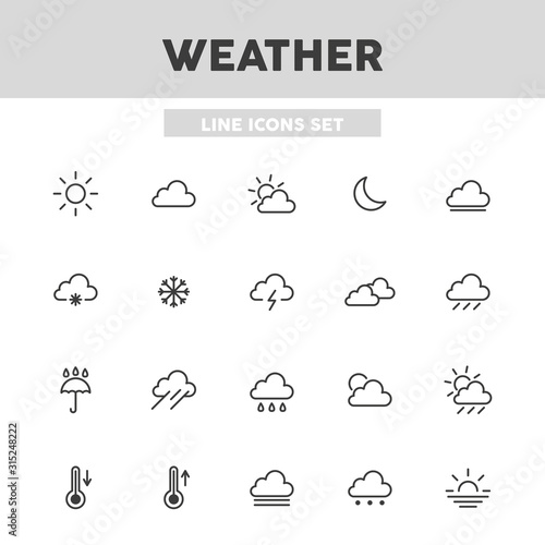 Weather, forecast simple set line icons. Clouds, sun, fog, rain, etc. Vector illustration symbol elements for web design.