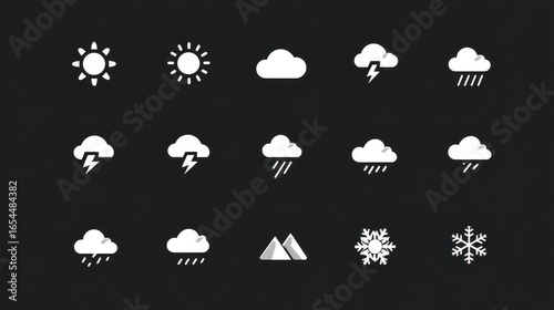 Weather Icons, forecast symbols on a black screen, minimal design, for apps