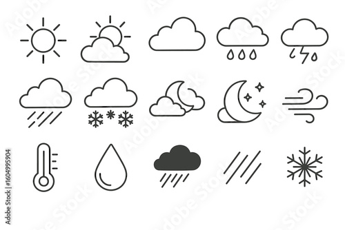Weather icons set: sun, cloud, rain, snow, temperature, wind symbols