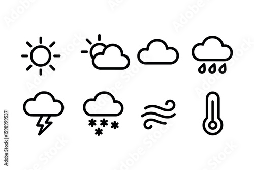 Weather icons: sun, cloud, rain, snow, wind, and thermometer symbols
