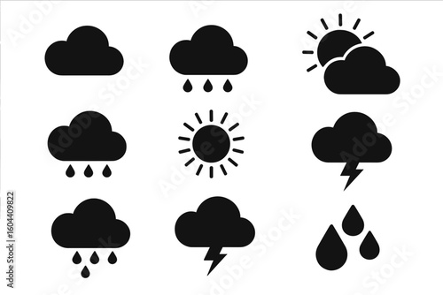 Weather icons vector set. Black silhouette collection of sun, cloud, rain, storm, and lightning symbols. Simple flat graphic design elements for forecast app or web.