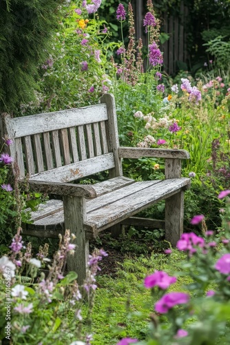 Weathered bench sits amidst vibrant garden flowers.