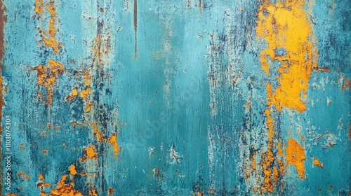 Weathered blue and orange metal surface with scratches and grunge details, ideal for highlighting industrial textures and artistic designs.