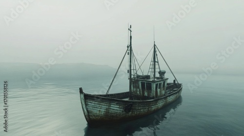 Weathered fishing vessel floats on calm water, obscured by heavy mist. Distant land hazy