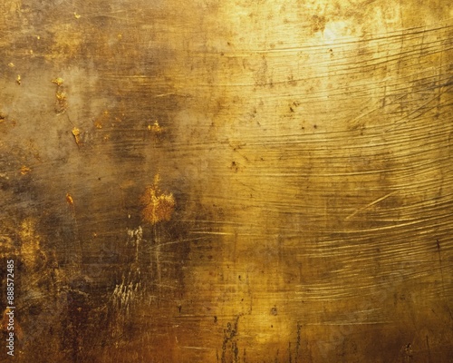 Weathered golden metal surface with intricate texture, distressed scratches, and faded patina reflects light unevenly, revealing subtle imperfections and characterful wear.