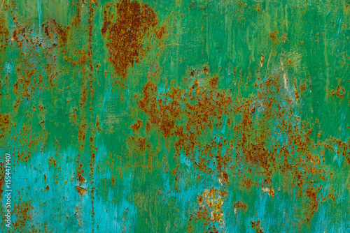 Weathered green metal surface with rust in industrial setting