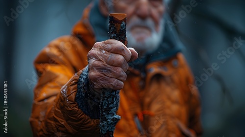 Weathered Hand Gripping Wooden Walking Stick in the Great Outdoors