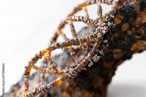 Weathered, intricate double helix structure resembling DNA or a root, with glowing sections and white lichen-like clusters on a textured surface.