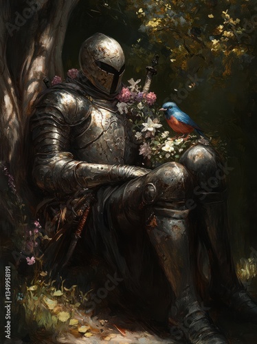Weathered knight rests, wildflowers, bird, forest. Fantasy art, book cover