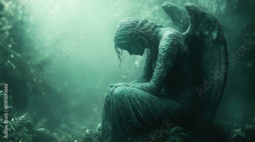 Weathered Stone Angel Statue with Wings in a Foggy Forest
