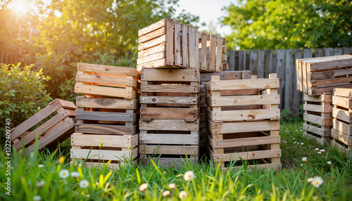 Weathered wooden crates stacked in sunny garden, rustic charm