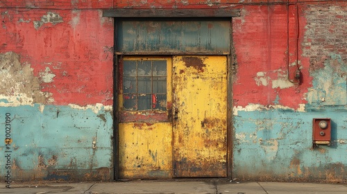 Weathered yellow door in a red and blue painted wall with sidewalk.