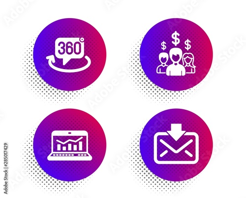 Web analytics, Salary employees and 360 degree icons simple set. Halftone dots button. Incoming mail sign. Statistics, People earnings, Virtual reality. Download message. Business set. Vector