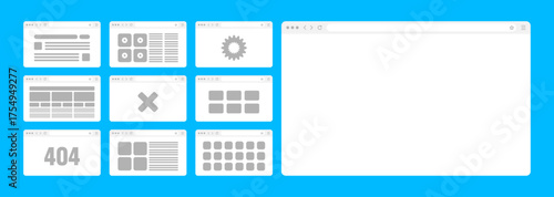 Web browser window, pages layout with toolbar and search field. Modern website, internet page in flat style. Browser mockup for computer, tablet and smartphone. Adaptive UI. Vector illustration.