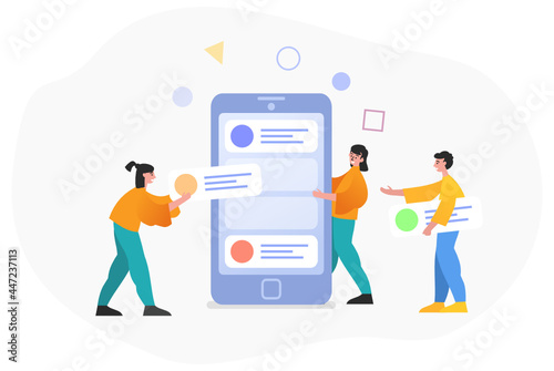 Web or mobile application development studio, team. Group of people stand near big mobile phone. Modern vector illustration