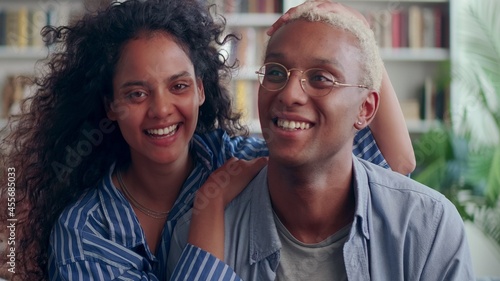 Webcam view of happy international young couple in love talking on video call. Smiling young Indian woman and her African American boyfriend communicate with friends remotely via video calls.
