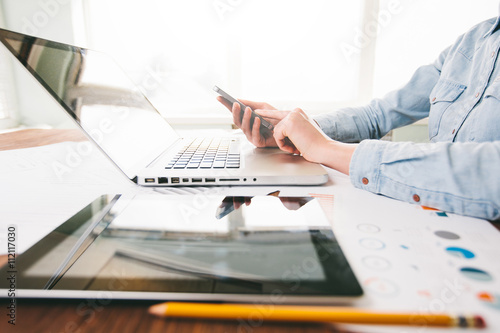 Website developers working using laptop at the office on wooden