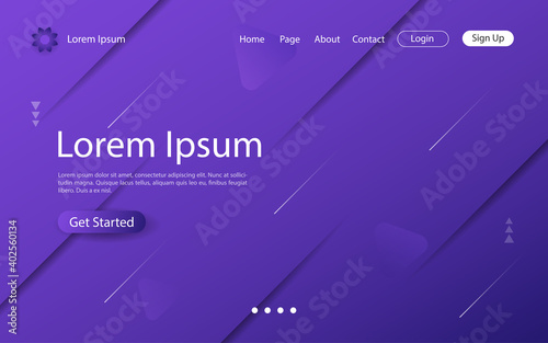 Website landing page design with abstract geometric and dynamic shapes on violet color background. Vector illustration eps10.