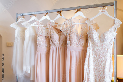 Wedding and bridesmaids dresses hanging on a metal hanger