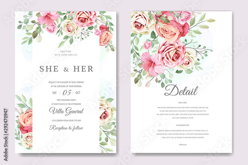 wedding and invitation card with floral and leaves template