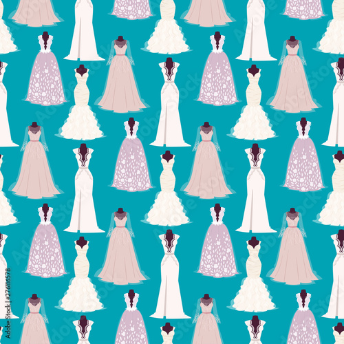 Wedding bride dress elegance style celebration bridal shower clothing accessories seamless pattern background vector illustration.