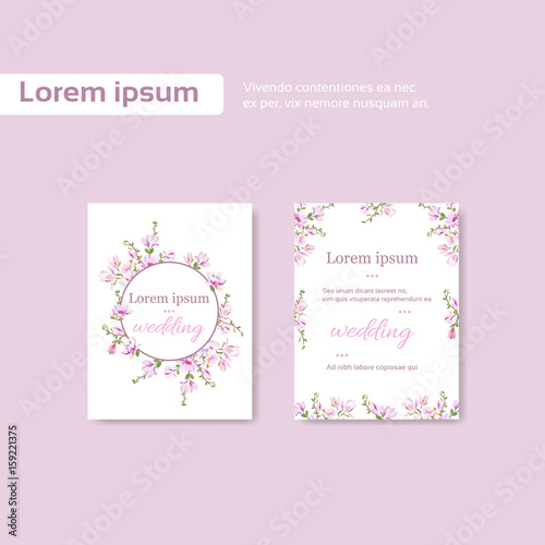 Wedding card, invitation, greeting, with flowers and branches of a blooming magnolia in pink and purple.