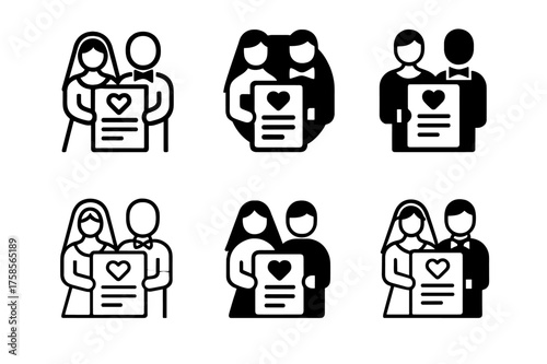 Wedding Certificate Logos. Couple holding wedding certificates. Set Logo of Celebration: wedding couple with document icon. harmonious logo variations of the