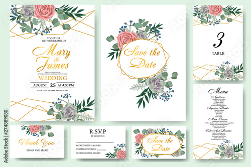 Wedding floral invitation card save the date design with green leaf herbs eucalyptus, rose, succulent and golden frame. Botanical elegant decorative vector template