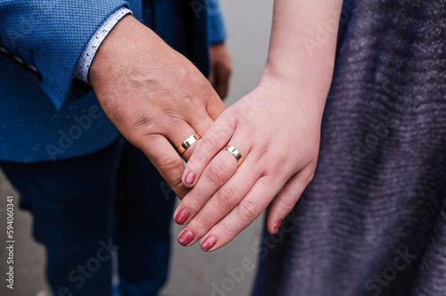 Wedding gold rings on the hands of the newlyweds. Gold rings on the hand of a man and a woman
