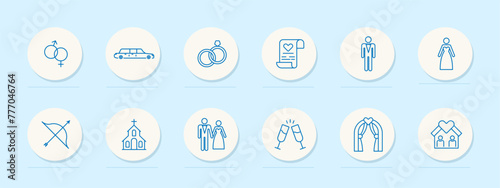 Wedding icon set. Document, wine, sex, glasses, church, heart, wife, wedding dress and suit, man, groom, house, limousine, bow, marriage certificate, altar. Marriage concept. Vector line icon.