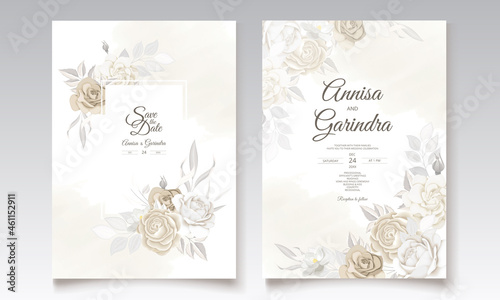 Wedding invitation card template set with beautiful floral leaves decoration Premium Vector